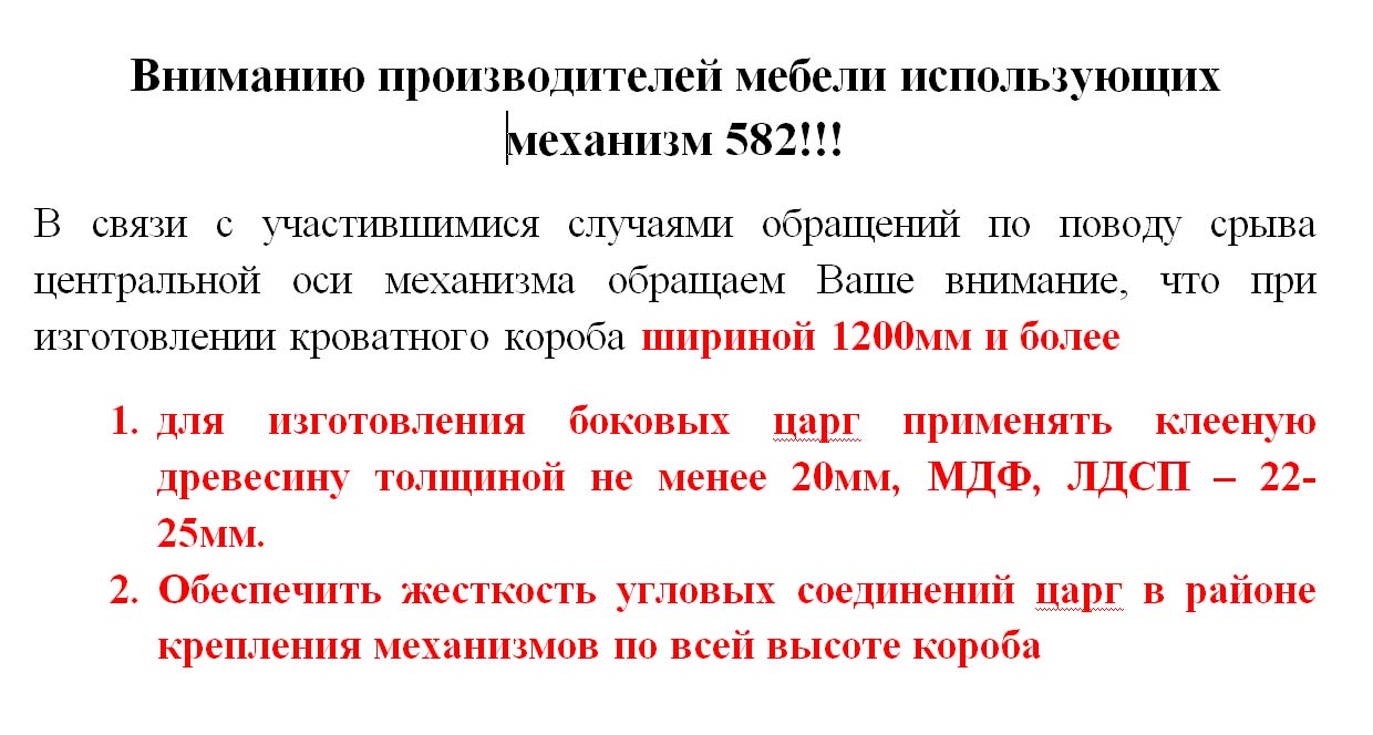 Механизм подъёма откидной шкаф-кровати №582 выпускается с подшипником скольжения (биметаллическая втулка) в узле вращения. Проведено тестирование данного узла, после 1000 циклов открывания – закрывания видимых следов износа не обнаружено. Установленный подшипник уменьшает трение между вращающимися деталями и исключает образование металлической пыли в данном узле, что повышает надёжность механизма и его потребительские свойства.