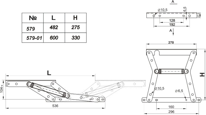 Возможно 2 вида механизма ― в зависимости от длины (482 мм или 600 мм), от высоты (275 мм или 330 мм). Размеры и габариты изделия см. на рисунке внизу страницы.