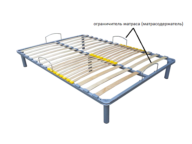 Ограничитель матраса (матрасодержатель) предназначен для фиксации матраса на ортопедическом основании, когда матрас не фиксируется коробом самой кровати. Количество ограничителей зависит от конструкции спального места кровати, а также его размера. Монтаж ограничителя осуществляется путем защелкивания его в профиль ортопедического основания, при этом толщина профиля должна составлять 30мм.