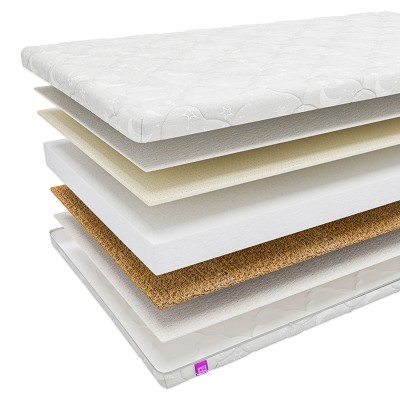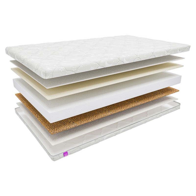 Малышу до 2 лет полезнее будет спать на умеренно-жесткой стороне. Её образует кокосовая койра. В сочетании с эластичным блоком холлкона поверхность становится упругой. Холлкон высотой 6 см заменяет собой пружинный блок. Это экологически чистый и нетоксичный материал, не впитывающий влагу и запахи. Он смягчает койру, придавая модели анатомические свойства. Когда позвоночник ребенка достаточно окрепнет, можно перевернуть матрас на среднюю по степени жесткости поверхность с латексом - натуральная пена с высокими анатомическими свойствами. Латекс поможет малышу расслабиться после насыщенного дня, быстро заснуть и восстановить силы для новых приключений.