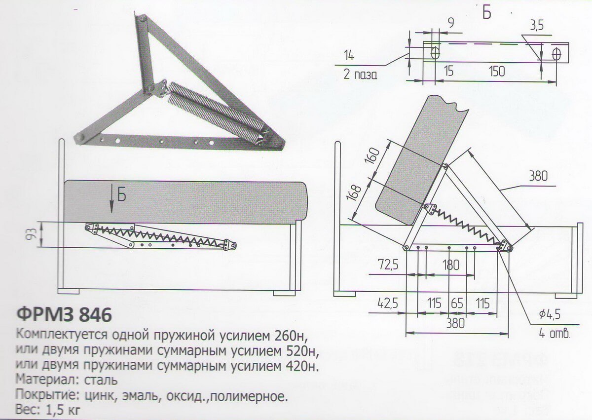 Механизм относится к типу «механизмы подъема». Механизм используется для подъема оснований тахты. В комплекте левая и правая часть механизма + 2 пружины.Синхронизатор приобретается дополнительно.