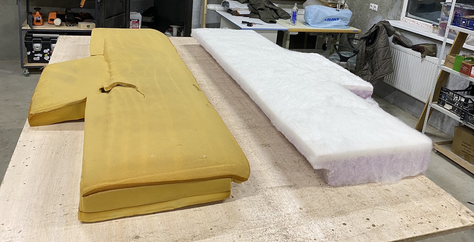 За основу наполнения мы взяли поролон, но не стали экономить на его качестве и поэтому использовали 28-ю и 32-ю плотности (чем выше плотность, тем более долговечен поролон).